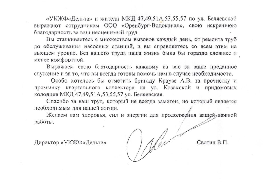 Директор ООО «Управляющая компания жилищным фондом «Дельта» Владимир Свотин благодарит сотрудников водоканала за нелегкий труд и выражает признательность бригаде аварийно-восстановительных работ №5 участка по эксплуатации канализационных сетей под руководством Владимира Краузе за прочистку и промывку канализационного коллектора по ул. Казахской и придомовых колодцев многоквартирных домов по ул. Беляевской, №47, 49, 51а, 53, 55, 57. Этим же специалистам говорят спасибо за добросовестную работу и горожане, проживающие на ул. Овражной.