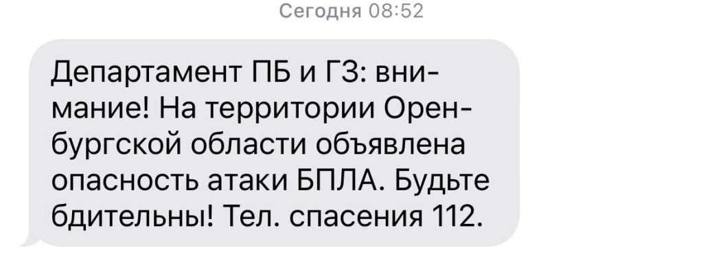 — На территории Оренбургской области объявлена опасность атаки БПЛА. Будьте бдительны! телефон спасения 112, — говорится в сообщении.