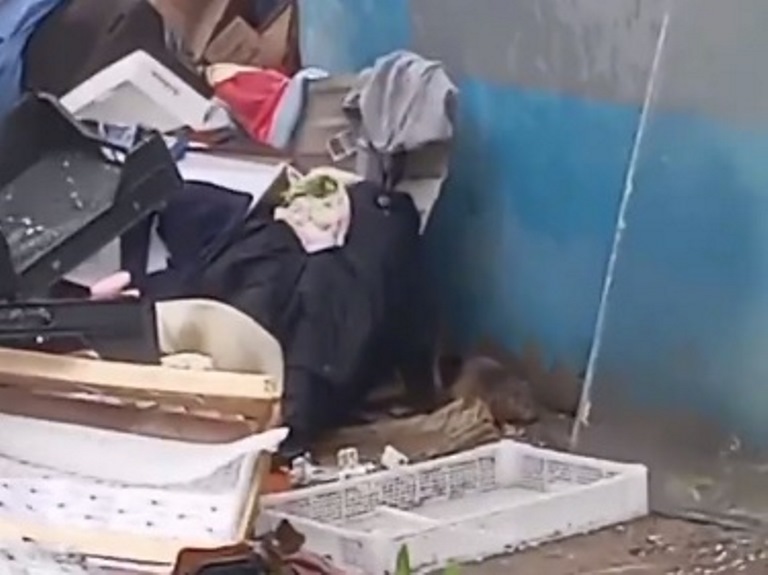 Жильцы сняли грызунов на камеру мобильного телефона. Судя по кадрам, крысы живут вольготно и почти не прячутся от человека. Они поселились среди выброшенных вещей и тары.