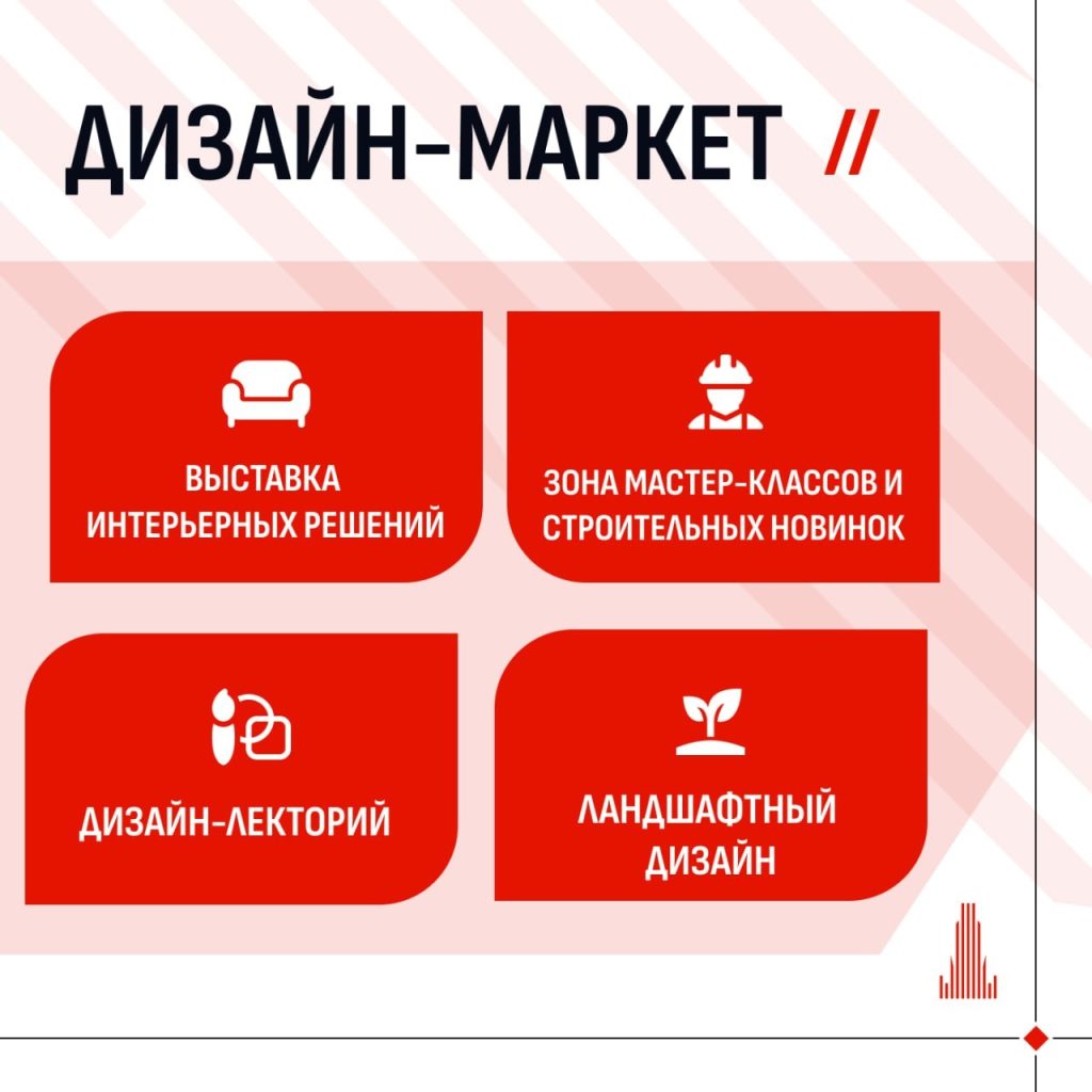 Впервые на большой строительной выставке появится отдельная локация для дизайнеров и тех, кто ищет интерьеры. Дизайн-маркет объединяет тех, кто создает уникальные решения для квартиры, дома и офиса. Если вы ищете специалиста для дизайна дома или в офисе, то он, вероятно, также будет здесь.