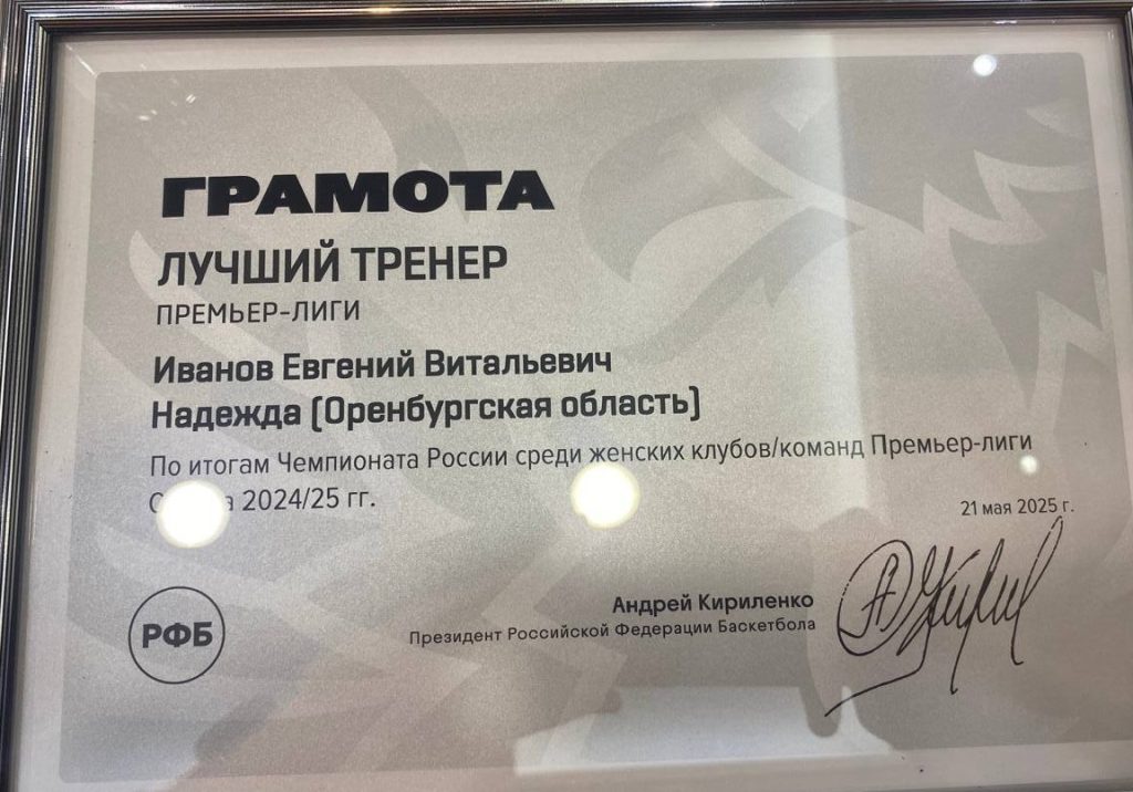 Лучшим тренером женской баскетбольной премьер-лиги по итогам сезона признан Евгений Иванов из оренбургской «Надежды».