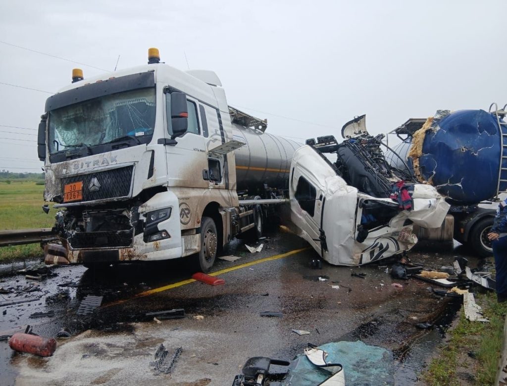 СИТРАК отбросило на впереди стоящий автомобиль КАМАЗ в сцепке с полуприцепом-цистерной. Как сообщают очевидцы, автомобили получили серьезные механические повреждения. Один из автомобилей перевозил нефтепродукты, часть вытекла на трассу.