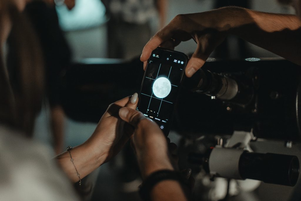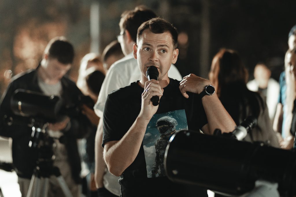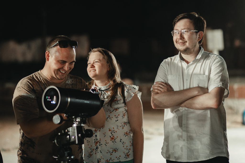 На площадке были установлены пять различных телескопов с увеличением от 40 до 150 крат. Рассмотреть кратеры на Луне и увидеть ее в розовом оттенке летней дымки смогли все желающие.