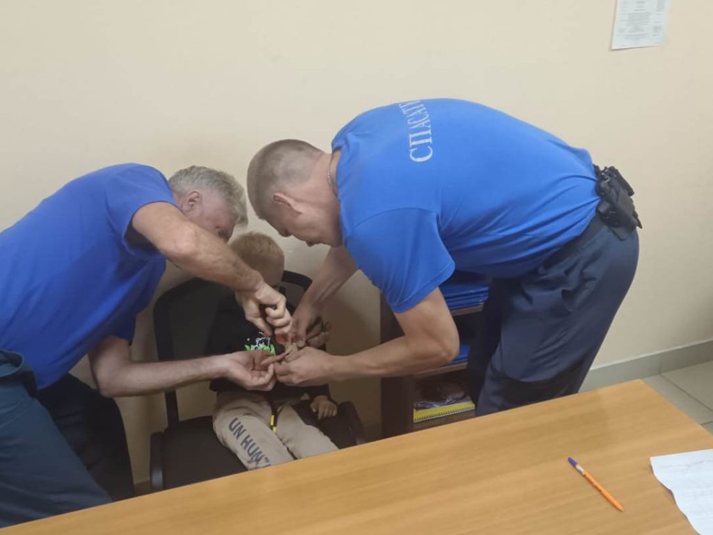 Спасатели отвлекали маленького ребенка разговорами и параллельно пытались аккуратно стянуть шайбу с пальца. Она не поддавалась.