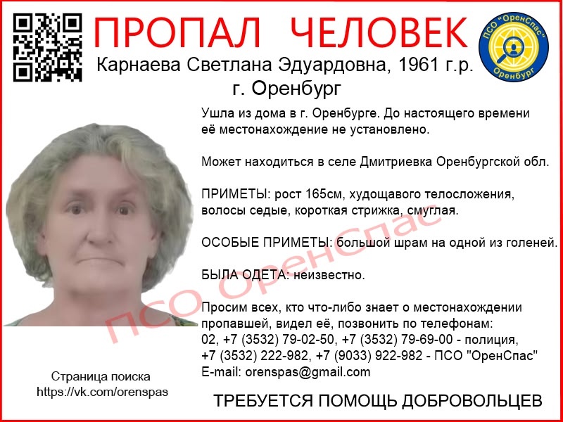 Всех, кто что-либо знает о местонахождении пропавшей или видел её, просят позвонить по телефонам: 02, +7 (3532) 79-02-50, +7 (3532) 79-69-00 — полиция, +7 (3532) 222-982, +7 (9033) 922-982 — ПСО «ОренСпас».