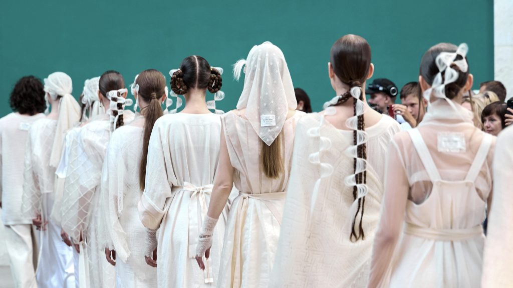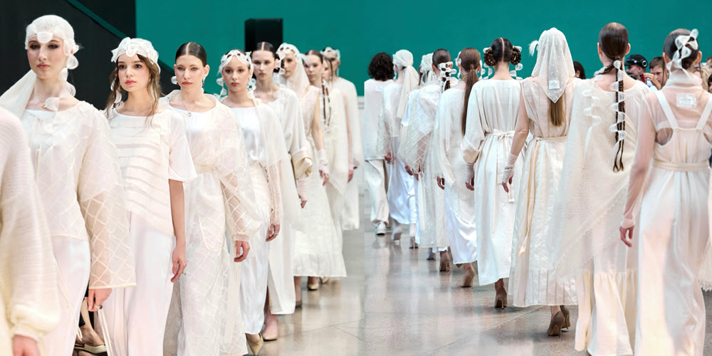 Эмоциональный объем через архитектурную работу с тканью добавила артель «Воскресение», создав модные образы через асимметричные формы, драпировки и ритмическую фактуру. Дизайнеры объединили