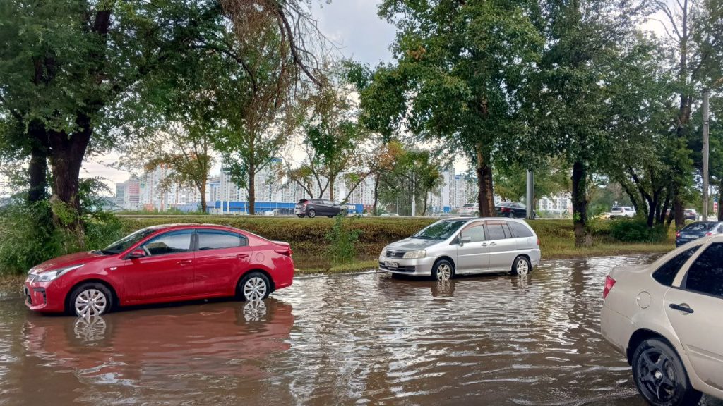 Особенно сильный дождь прошел в районе Степного. В меньшей степени осадки затронули центр города. Местами автомобили наполовину уходили под воду в процессе движения.