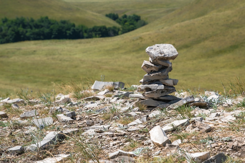 Заключительная остановка – Долгие горы. Живописный хребет вытянулся между Уралом и Сакмарой на целых 14 километров. Это место любят туристы, что доказывают растущие с каждым годом туры – искусственные пирамиды из камней, которые здесь постоянно достраивают путешественники.