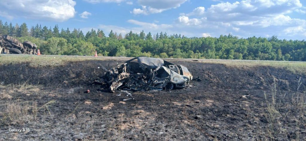 По данным полиции, днем 3 августа на трассе в районе села Никольское водитель Toyota выехал на встречную полосу и столкнулся с КамАЗом. От удара иномарка вспыхнула.