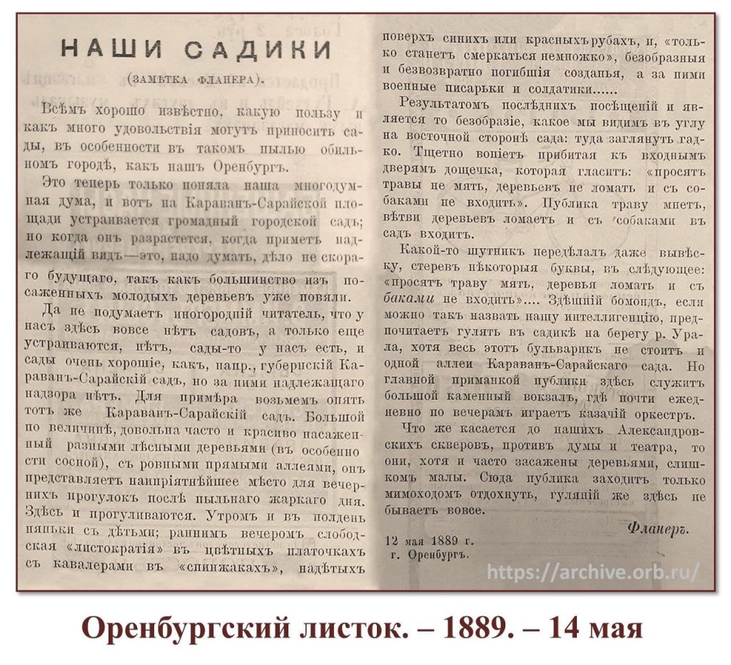 Журналист из дореволюционного «Оренбургского листка» пишет о том, что хорошие сады в Оренбурге есть, но должного ухода и надзора за ними так и не появилось. Жалуется автор не только на уход за парками, но и за общественный правопорядок — более того, на нравы.