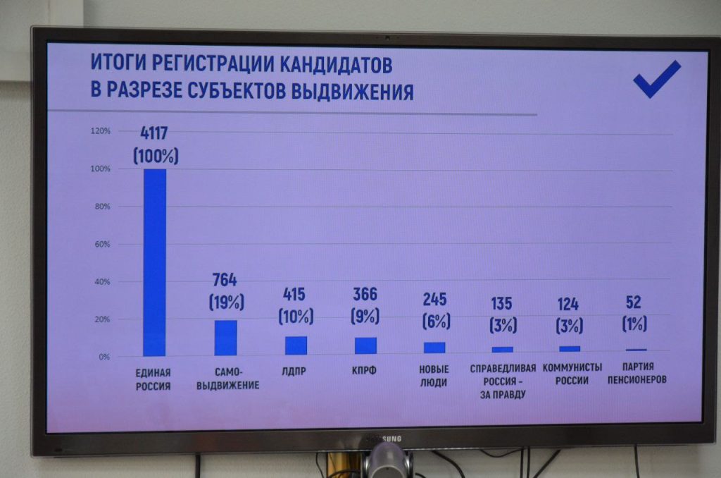 — Стопроцентное выдвижение обеспечила только одна партия — «ЕДИНАЯ РОССИЯ». На втором месте — самовыдвиженцы, их 764 человека (19%). Число отказов в регистрации составило чуть более 1 %. Уровень отказов достаточно низкий, особенно учитывая такое значительное количество выдвинувшихся кандидатов — более шести тысяч человек. Абсолютное большинство кандидатов благополучно дошли до финиша, и их фамилии будут представлены в избирательных бюллетенях, — подчеркнула глава комиссии.