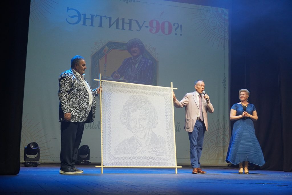 В антракте он даже был выставлен в фойе на общее обозрение. Игорь Храмов отметил, что Юрий Энтин и Давид Тухманов в 2005 году написали гимн Оренбурга и передал юбиляру подарок от администрации Оренбурга и Оренбургского городского совета – огромный пуховый плед, тоже выполненный по спецзаказу.