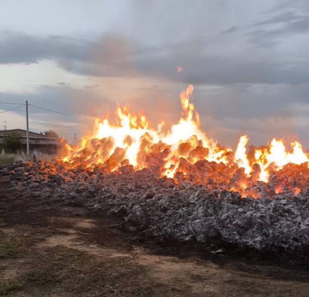 На заднем дворе загорелось сено, складированное в тюках. Огонь перекинулся на автомобиль, который был частично поврежден пожаром.