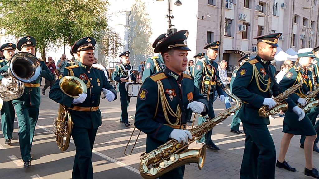 По улице Советской в Оренбурге накануне прошёл Парад оркестров. Пять военных музыкальных коллективов выступили в честь Дня города.