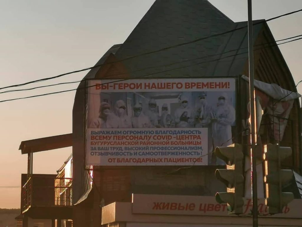 Фото баннера опубликовал региональный минздрав. Отмечается, что это — благодарность пациентов. «Вы — герои нашего времени! Выражаем огромную благодарность всему персоналу COVID-центра Бугурусланской районной больницы», — говорится на баннере.
