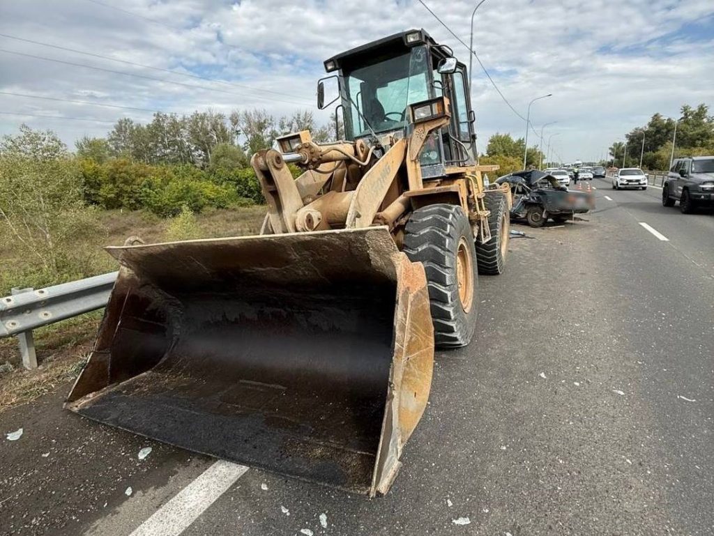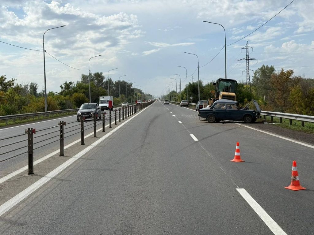Тяжелая техника стояла на краю дороги в связи с ремонтом колеса. От удара ВАЗ развернуло поперек дороги.