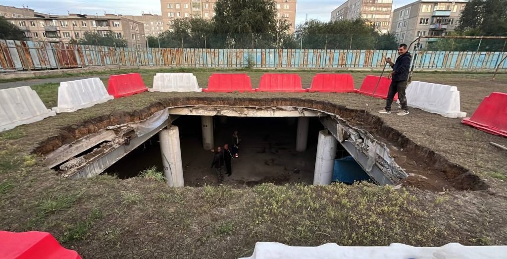 Покрытие футбольного поля обрушилось, образовав огромный провал, сообщает издание Урал56.