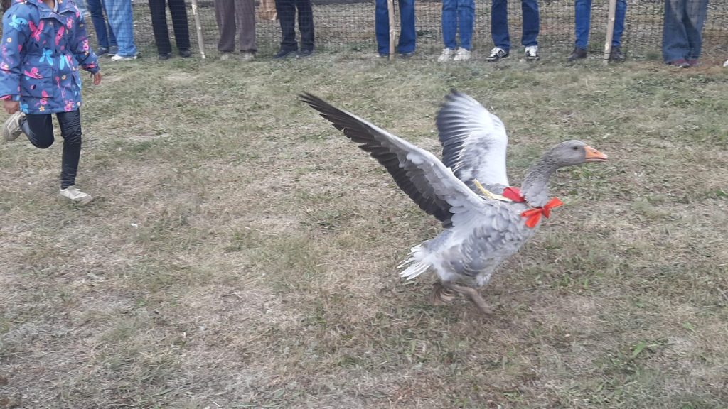 Гуси под контролем пастухов вышли на забег на короткую дистанцию по «олимпийской системе». У каждого участника — собственное имя, родословная и характер. Например, Дядя Га-Га любит есть яблоки, а Ганс предпочитает пшеницу и кабачки.