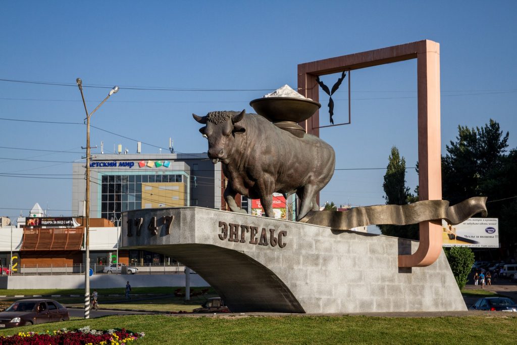 - Бык-солевоз (пересечение ул. Тельмана и Полиграфической). Символизирует зарождение города как центра соляного промысла. Эта кованая медная фигура — прямая отсылка к гербу Энгельса.