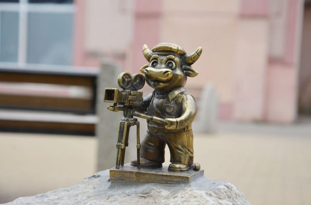- Бык-кинооператор (у кинотеатра «Родина»). Хранит память о развитии кинематографа в Энгельсе. Поверье: прошепчите желание, дотронувшись до его кинокамеры.