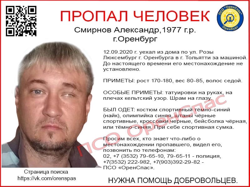 Александр Смирнов 12 августа 2020 года уехал из дома по улице Розы Люксембург Оренбурга в город Тольятти за машиной. 14 августа позвонил и сообщил, что выезжает домой. После этого связь с ним пропала. До настоящего времени местонахождение оренбуржца не установлено.