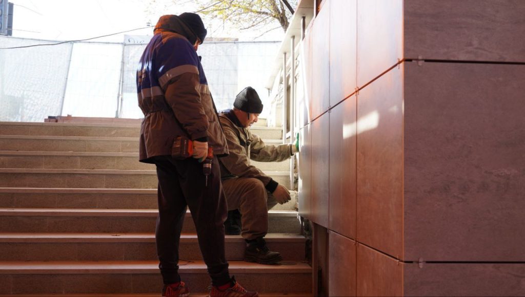 Сейчас рабочие монтируют вентилируемый фасад и каркас под облицовку стен гранитной плиткой, проводят гидроизоляцию методом инъецирования. В ближайшее время планируется завершить отделку стен и потолка перехода.