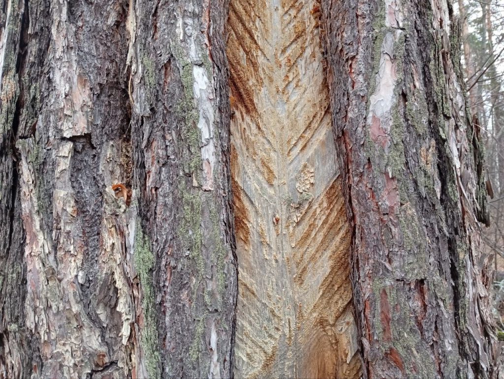 Эти вертикальные насечки похожи на застывшие слезы. И это не природный рисунок, а следы давно забытого промысла — подсочки, а сами насечки носят древнее название карры. Они — немые свидетели эпохи, когда в лесу кипела работа, и слышались удары хака в руках вздымщика.