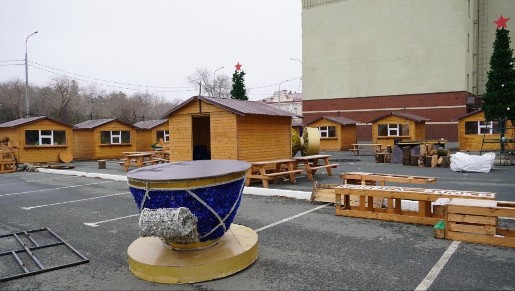 К настоящему моменту на территории Новогоднего городка уже смонтировали корт будущего катка и собрали домики, в которых разместится маркет еды.