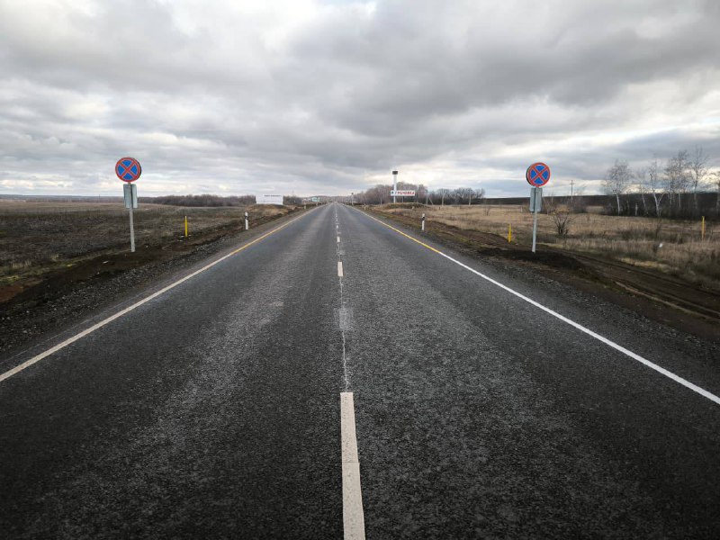 На участке, начинающемся от районного центра, подрядчик полностью заменил дорожную одежду, включая основание, обустроил обочины и примыкания, установил новые дорожные знаки, ограждения и нанес разметку.