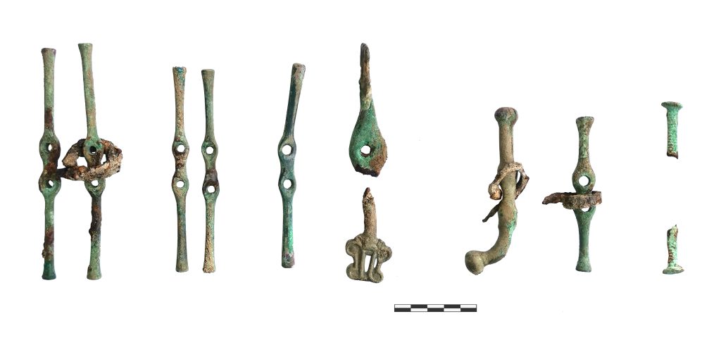 Среди обнаруженных предметов — ажурные прорезные налобники для лошадей, орнаментированные круглые бляхи и элементы узды, аналоги которых известны по комплексам Северного Кавказа, Подонья и Северного Причерноморья. Всего в жертвенном комплексе найдено более 100 предметов, не считая мелких деталей таких как, например, бронзовые пронизи, которых здесь найдено более 500.