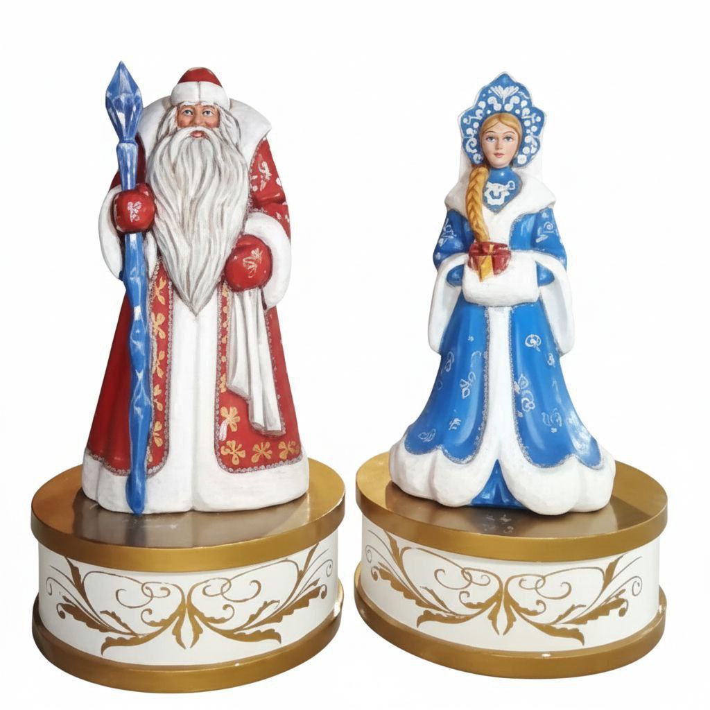 Рядом с 12-метровой новогодней елкой разместятся сказочные персонажи — Дед Мороз и Снегурочка. Фигуры изготовлены из прочного морозоустойчивого стеклопластика и будут установлены на специальные декоративные подиумы. Общая высота каждой композиции составит 2,7 метра.
