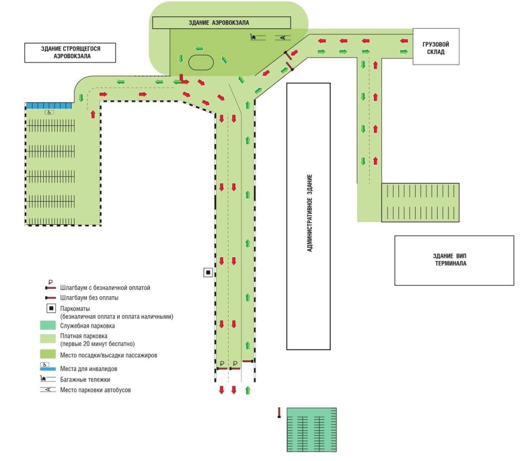 Новая платная парковка расположена перед зданием нового терминала. Заезд на ее территорию осуществляется через один въезд с автоматическим шлагбаумом. С момента его пересечения начинается отсчет времени для тарификации.
