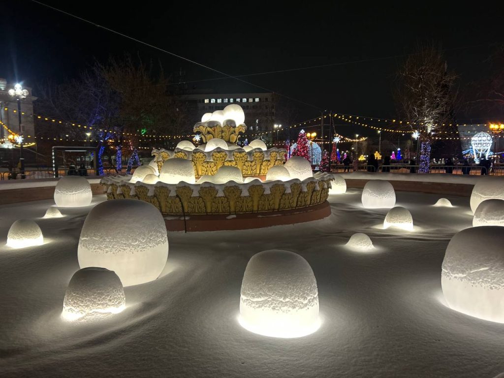 Несколько сотен жителей города, несмотря на мороз, пришли на праздник. На площади работают фотолокации, открыт большой фудкорт с глинтвейном и угощениями, есть каток и множество развлечений для самых юных оренбуржцев.