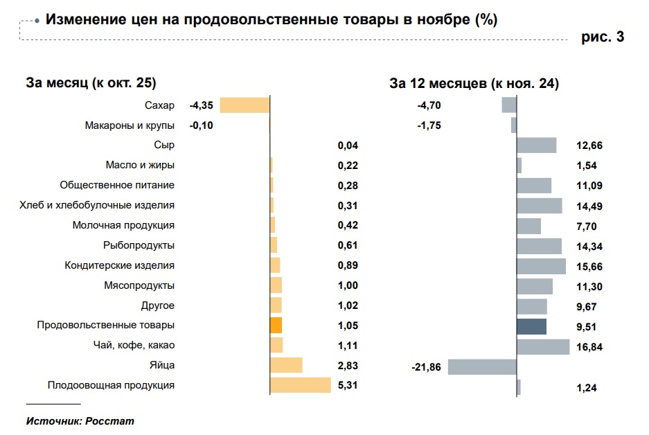 Подорожание яиц также продолжилось: производители компенсируют рост себестоимости, вызванный удорожанием кормов и логистики. Тем не менее по сравнению с ноябрем 2024 года яйца подешевели на 21,86%. Выросли цены на кофе из-за сокращения мировых поставок, тогда как сахар подешевел на 4,7% благодаря рекордному урожаю сахарной свеклы в России.