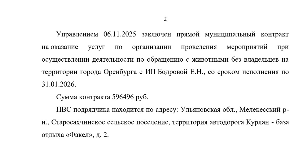 Кроме того, управление регулярно рассылает предложения о заключении прямого контракта на оказание услуг по отлову безнадзорных животных на территории Оренбурга различным подрядчикам, в том числе и из других регионов.