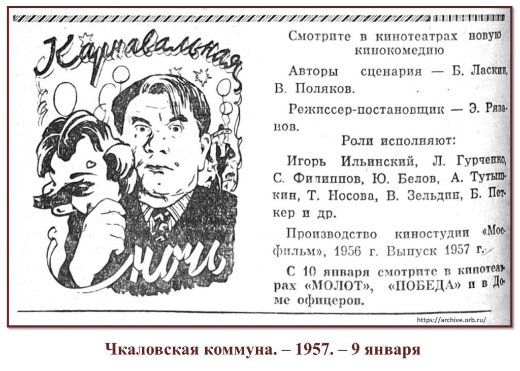 В кинотеатрах страны в эти дни идут премьеры фильмов-сказок «Чебурашка 2», «Простоквашино» и «Буратино». А 69 лет назад, в первые дни нового 1957 года, оренбуржцы спешили в кинотеатры на премьеру новой музыкальной кинокомедии «Карнавальная ночь», созданной молодым режиссёром Эльдаром Рязановым.