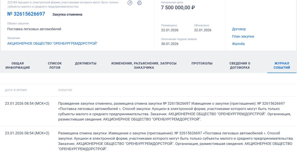 Как ранее писал «Оренбург Медиа», сообщение о закупке премиального автомобиля было опубликовано на портале 22.01.2026. Окончание подачи заявок датировалось 30.01.2026.