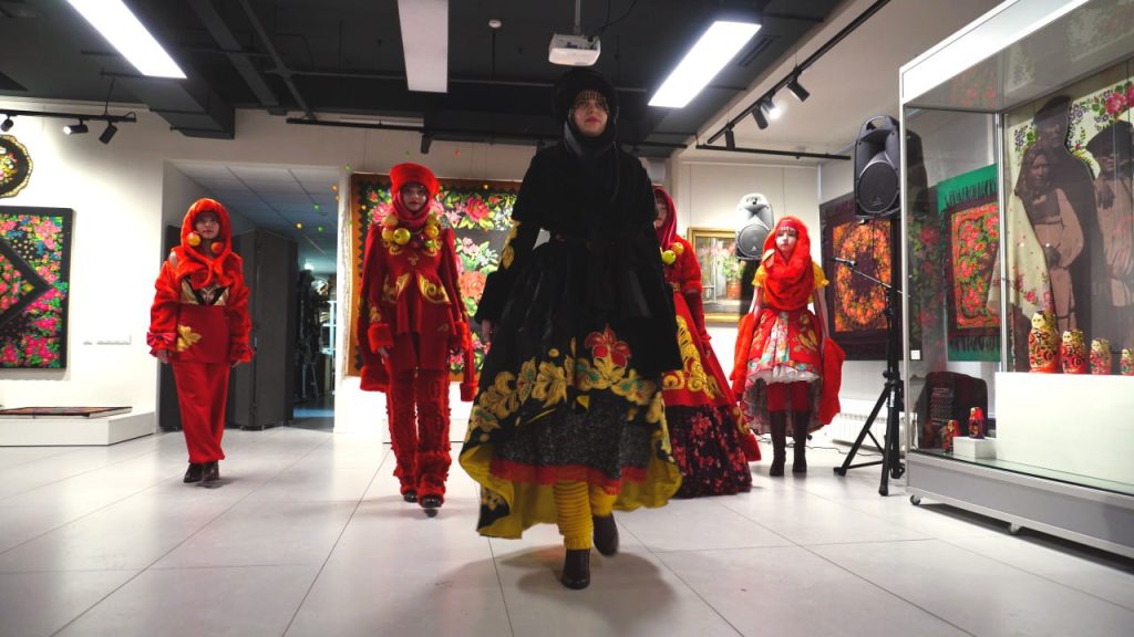 Центральная часть экспозиции — инсталляция из платков. Здесь представлены набивные павлопосадские платки второй половины XX века, редкий пуховый платок, созданный к Олимпиаде‑80, и уникальная паутинка с вязаными цветами. По задумке кураторов, зал превращается в настоящий «сад воспоминаний», где традиционные орнаменты разных эпох сливаются в единый образ весеннего пробуждения.