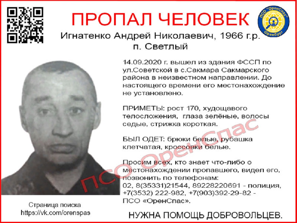 Мужчина проживал в посёлке Светлый Сакмарского района. 14 сентября 2020 года он вышел из здания ФССП по улице Советской посёлка Сакмара Сакмарского района и ушёл в неизвестном направлении. До настоящего времени его местонахождение не установлено.