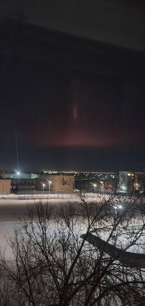 Вечером в субботу, 7 февраля, в пригороде Оренбурга наблюдали редкое атмосферное явление — световые столбы.