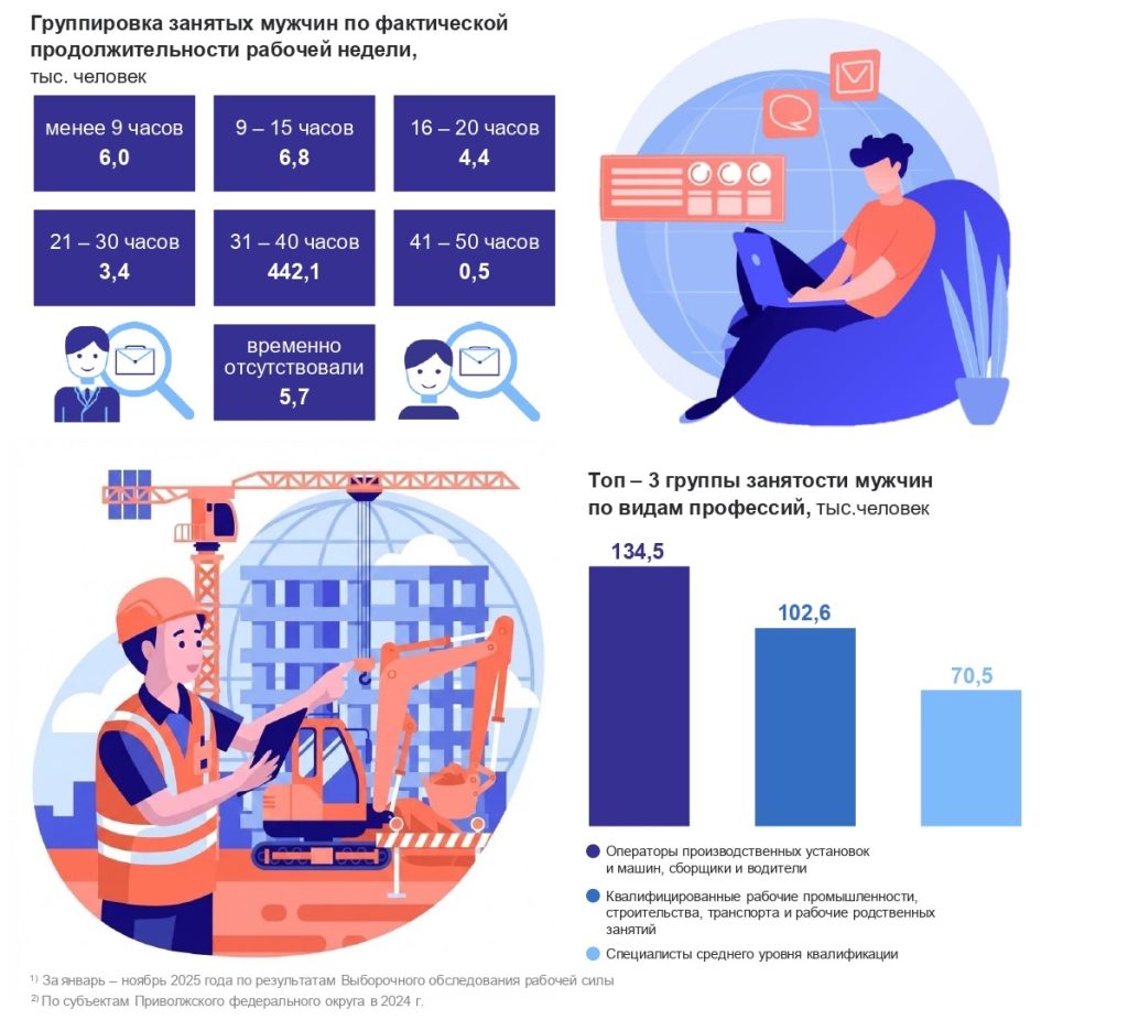 Средняя продолжительность рабочей недели — 38 часов. Оренбургские мужчины в разрезе регионов ПФО работают меньше, чем их коллеги в Самарской и Саратовской областях, а также Татарстане и Пензенской области.