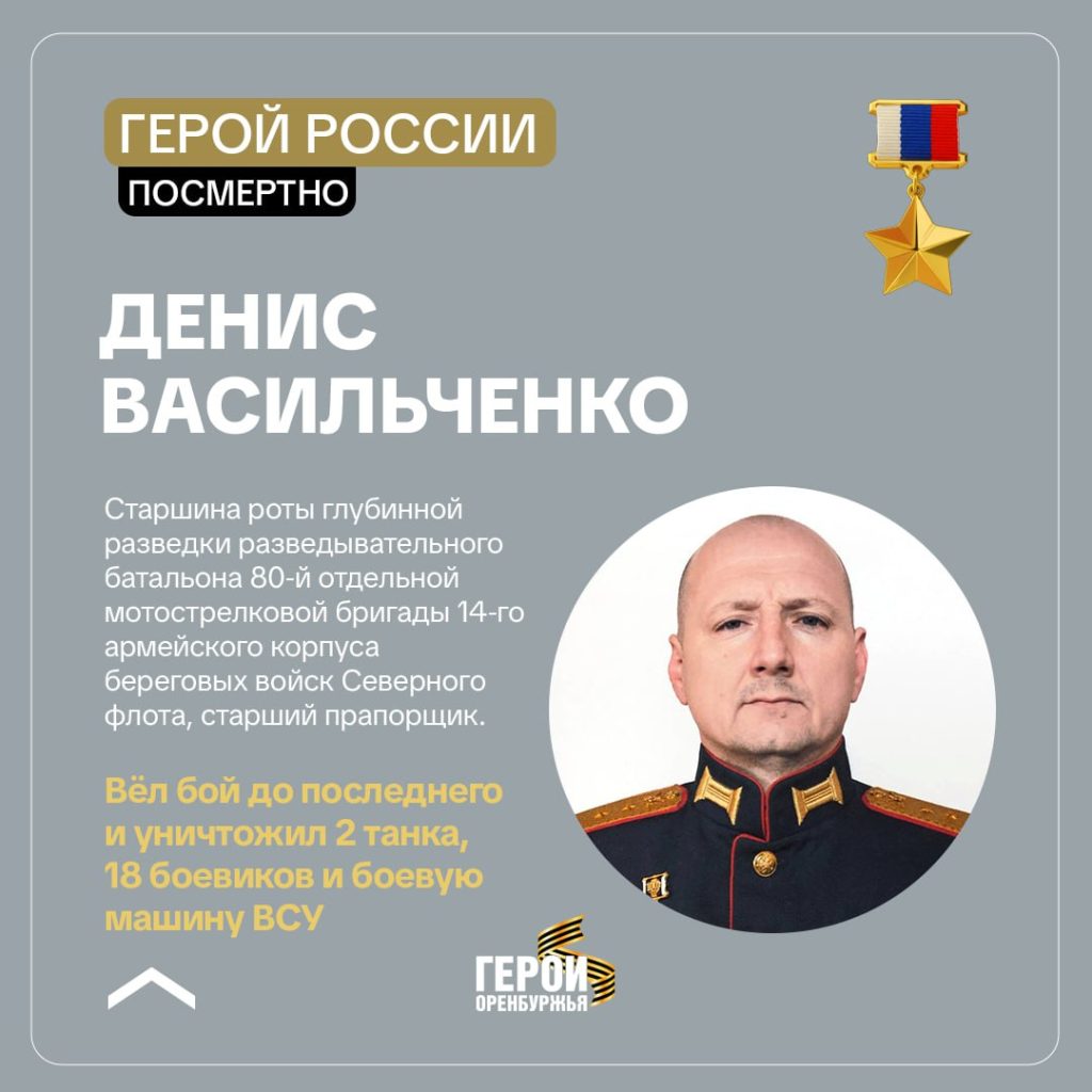 Оренбургский старший прапорщик, уроженец Ташлинского района Денис Васильченко, героически погибший в СВО, увековечил своё имя на катере «П-475» Кольской флотилии. Церемония прошла на Северном флоте с участием родных героя и военных.