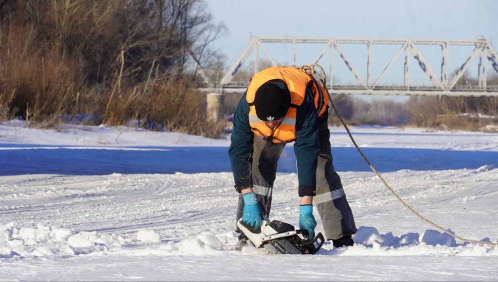 Ледяные оковы реки ослабляют для облегчения прохождения паводка. Лед распиливают в районе автомобильного моста, чтобы замерзшие глыбы не образовали затор у опор.