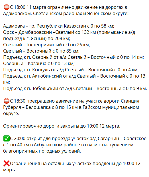 С 11:30 закрыт проезд по следующим автодорогам в Акбулакском районе: