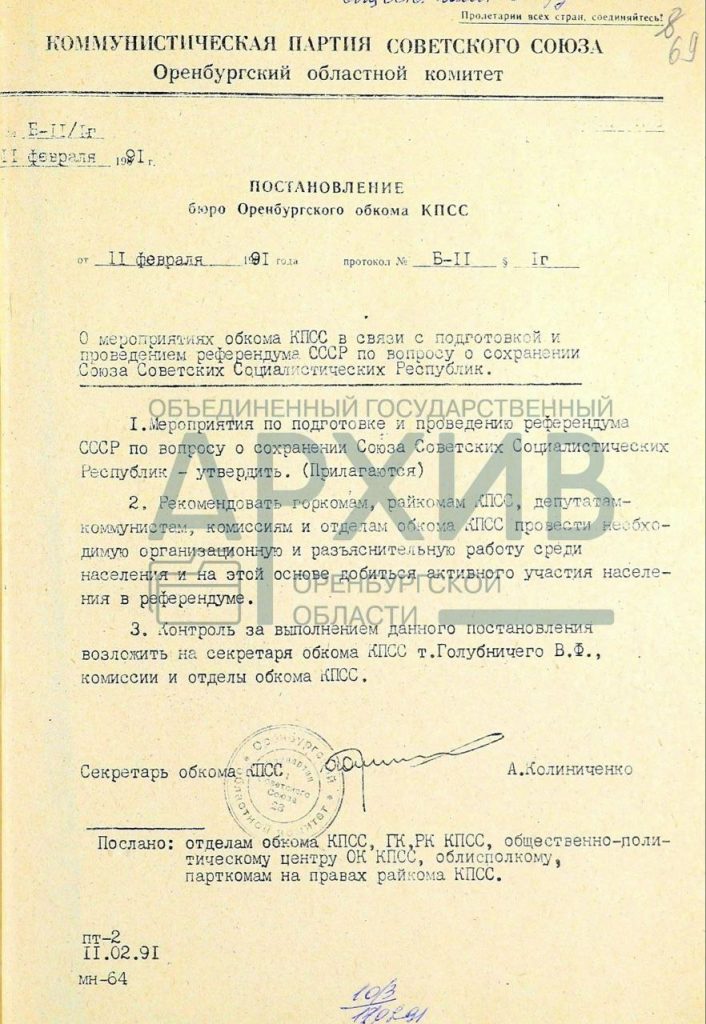 В Оренбургской области 11 февраля 1991 года на основании постановления обкома КПСС «О мероприятиях обкома КПСС в связи с подготовкой и проведением референдума СССР по вопросу о сохранении Союза Советских Социалистических Республик» началась организационная подготовка к первому и единственному в истории СССР всенародному референдуму.