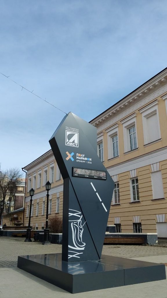 Стела на Советской появилась 28 марта. Уже в первый день она зарекомендовала себя как арт-объект, с которым фотографируются оренбуржцы. Слоган полумарафона – «Беги в степи!»
