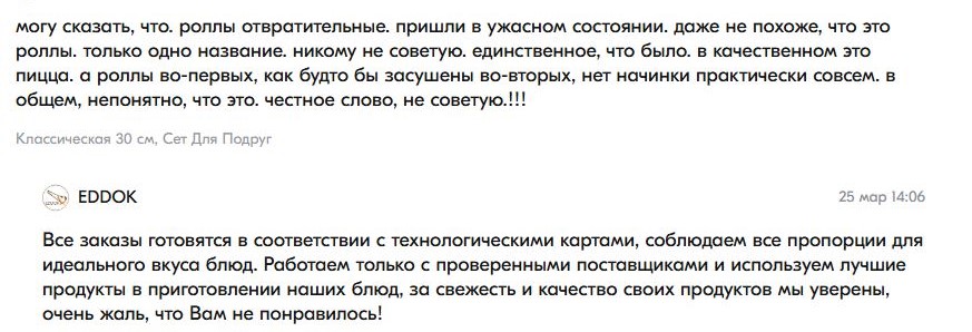 По итогам лабораторных исследований более 60% проб сырья, полуфабрикатов и смывов с оборудования не соответствовали гигиеническим нормативам. Еще в марте на сайте организации встречались негативные отзывы о блюдах.