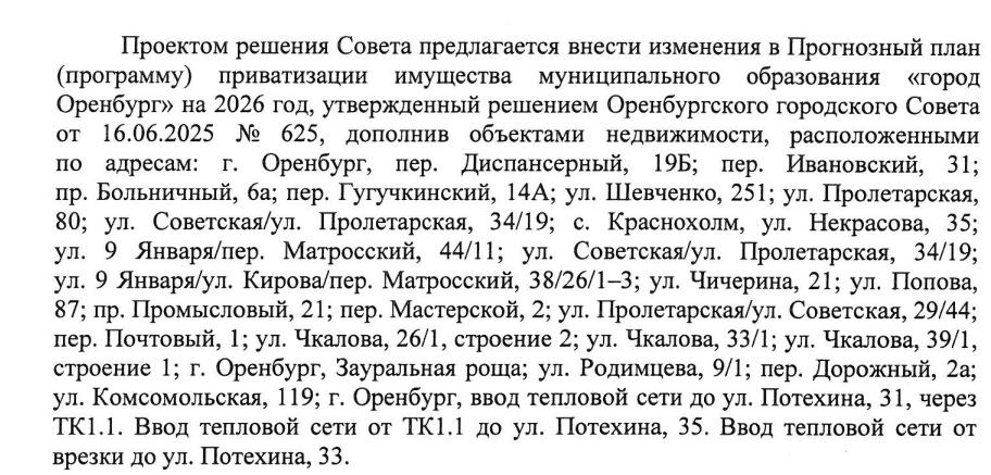 Как отметил в пояснительной записке глава Оренбурга Альберт Юмадилов, общий объем предполагаемого дохода от приватизации имущества в 2026 году возможен в сумме 163 миллионов рублей, из них 77 миллионов — в поправках, которые сегодня рассмотрит Оренбургский городской Совет.