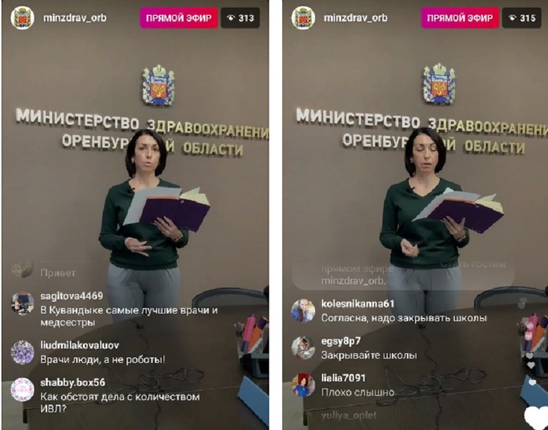 Министр здравоохранения Оренбургской области Татьяна Савинова провела очередной прямой эфир, в ходе которого доложила обстановку с заболеваемостью коронавирусом в регионе. Аудитория Instagram активно подключилась, заполнив эфир комментариями. В них были жалобы, слова благодарности медикам и просьбы закрыть школы.