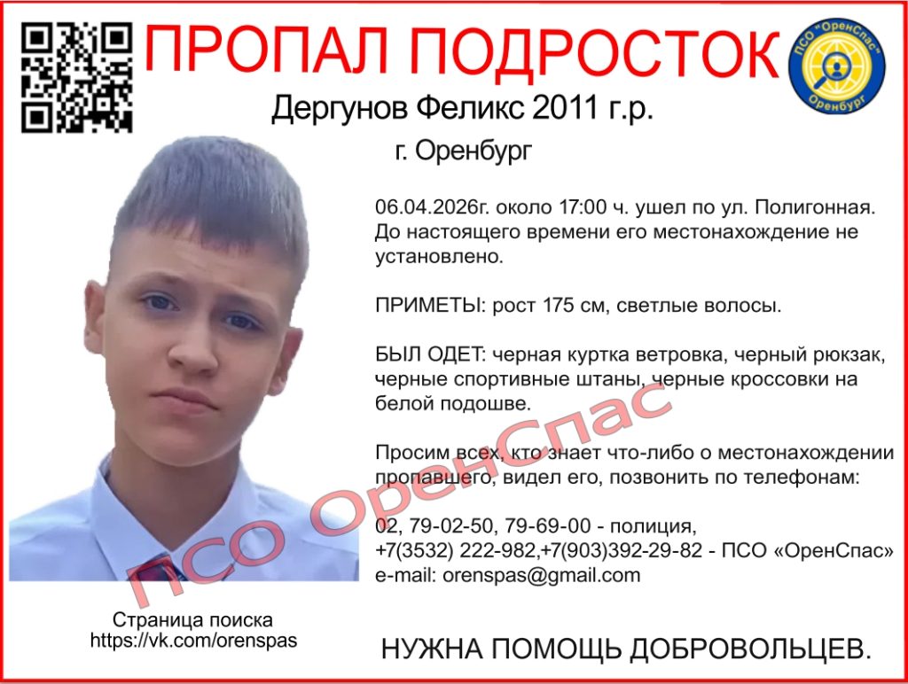 Всех, кто что-либо знает о местонахождении школьника или видел его, просят позвонить по телефонам: 02, 79-02-50, 79-69-00 — полиция, +7(3532) 222-982,+7(903)392-29-82 — ПСО «ОренСпас».